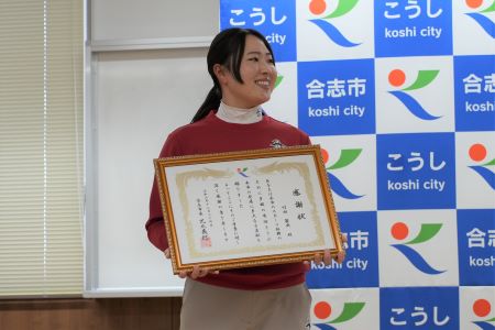 |合志市ふるさと大使|プロゴルファー・竹田麗央選手 最終更新日:2025年6月4日 竹田麗央選手に関する情報をご紹介します。【目次】※クリックしてください「麗央ちゃんからもらった絵本!」と大人気合志市のこどもたちに“世界の絵本”贈呈祝!アメリカツアー通算2勝目応援看板を設置しました!|合志市ふるさと大使|プロゴルファー・竹田麗央選手に委嘱 【令和7年6月4日追記】「麗央ちゃんからもらった絵本!」と大人気!竹田麗央選手から贈呈された“世界の絵本”。合志市内の保育施設では、日頃から行なっている読み聞かせの時間に活用しています。世界各地の絵本の物語や、色鮮やかな挿絵に興味津々のこどもたち。保育士が、「この絵本は誰からプレゼントされましたか?」と尋ねると、「麗央ちゃんからもらった絵本!」という元気な声が響いていました。絵本は、遠く離れた“世界の舞台”で活躍する竹田選手と、合志市のこどもたちを繋いでいます。(撮影協力:竹迫みのり保育園、あいあい保育園) 【令和7年3月24日追記】合志市のこどもたちに“世界の絵本”贈呈竹田麗央選手が、合志市の保育施設などに世界の絵本を贈り、3月18日、合志市役所で贈呈式を開催しました。今年からアメリカツアーに参戦し“世界の舞台”に挑戦している竹田選手。世界中の絵本をこどもたちに届けるサービスを展開する株式会社ワールドライブラリー(本社・東京都)の “絵本をひらくと、世界がひらく” というコンセプトに共感。『竹田麗央のえほんスマイルプロジェクト~熊本から世界へ~』 に取り組む中で、「合志市のこどもたちにも、世界に興味を持ち、さまざまな事に挑戦してもらいたい」という思いから、同社が手がける世界の絵本の贈呈を申し出ました。 こどもたちに「世界に興味を持ち、さまざまなことにチャレンジを」贈呈式では、竹田選手から「私は、こどもの頃にゴルフを始め、海外の試合を見ることで“世界で頑張ってみたいな”と思いました。こどもたちが世界に興味を持つことを願っています」と、メッセージが寄せられました。そして、代理で出席した、竹田選手の父・宜史さんが「世界の絵本から入ってくる情報に興味を持って、合志市のこどもたちにもさまざまなことにチャレンジして欲しいと思います」と挨拶し、こどもたちの代表に目録を渡しました。こどもたちの代表は、「たくさんの絵本をありがとうございました。みんなで仲良く読みたいと思います」とお礼のことばを述べました。また、合志市から竹田選手に感謝状を贈りました。贈呈式の後は、リーディングイベント『ワールドライブラリーツアー』を行ないました。こどもたちは世界中を旅するように、さまざまなことをクイズ形式で学んだ後、アメリカの絵本の読み聞かせを楽しみました。 【令和7年3月10日追記】祝!アメリカツアー通算2勝目3月9日、中国・海南島で開催されたゴルフのアメリカツアー『ブルー・ベイLPGA』最終日、竹田麗央選手が優勝しました。アメリカツアーは通算2勝目、今季からの本格参戦後5試合目での優勝です。おめでとうございます! 応援看板を設置しました!アメリカツアーへの参戦を前に、竹田選手を応援する看板を合志市役所近くの交差点に設置しました。みんなで竹田選手を応援しましょう! 竹田選手に関する情報竹田選手のインスタグラムこちらをクリック(外部リンク)してください!合志市YouTubeチャンネル令和6年1月に行なわれた『二十歳を祝う会』で合志市のインタビューに答える竹田選手(「今年の目標はツアー初優勝」と話した竹田選手。この3か月後に見事有言実行しました!)画像、またはこちらをクリック(外部リンク)してください! ※以下、令和6年12月26日に投稿した内容です。 |合志市ふるさと大使|プロゴルファー・竹田麗央選手に委嘱委嘱状を持つ竹田麗央選手本市出身や、ゆかりの人に、自身の活動を通じて本市をPRしていただく『合志市ふるさと大使』。令和6年12月24日、本市出身のプロゴルファー・竹田麗央選手に委嘱しました。 輝かしい実績を引っ提げ“合志市から世界へ”竹田選手は、合志市立南ヶ丘小学校、合志中学校の出身で、高校生だった令和3年、プロテストに合格しました。令和6年、熊本で行なわれた大会でツアー初優勝を成し遂げるなど国内8勝をあげ、JLPGA年間女王をはじめ数々の賞に輝きました。令和7年にはアメリカツアーに参戦する竹田さんに“合志市”の名を世界に広めてもらおうと大使の委嘱を依頼し、快諾いただきました。(写真は令和3年11月・合志市撮影) アメリカツアーで活躍し、良い報告をしたい令和6年12月24日に合志市役所で開催した『合志市ふるさと大使委嘱状交付式』。多忙なオフの合間を縫って登場した竹田選手に、市内の自治会や企業、商工関係の代表などの出席者から大きな拍手が贈られました。交付式では、令和6年シーズンの活躍をお祝いし、竹田選手と同級生の本市職員から花束、母校の南ヶ丘小、合志中の児童・生徒から本市の農産物な