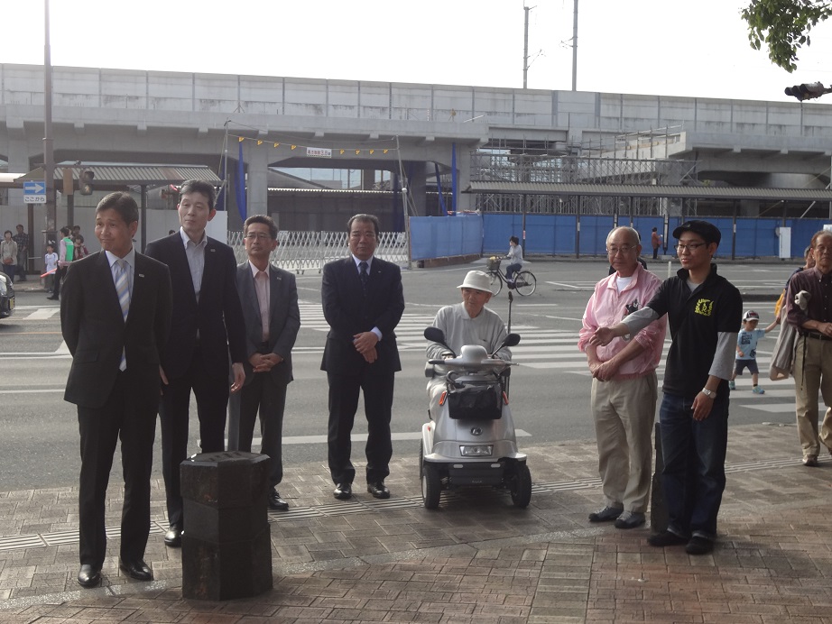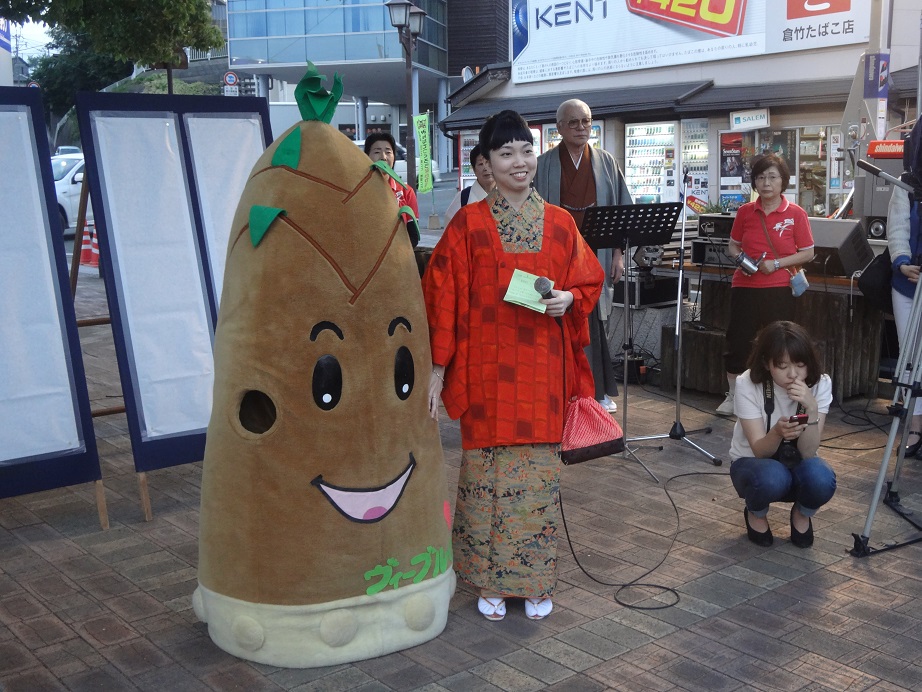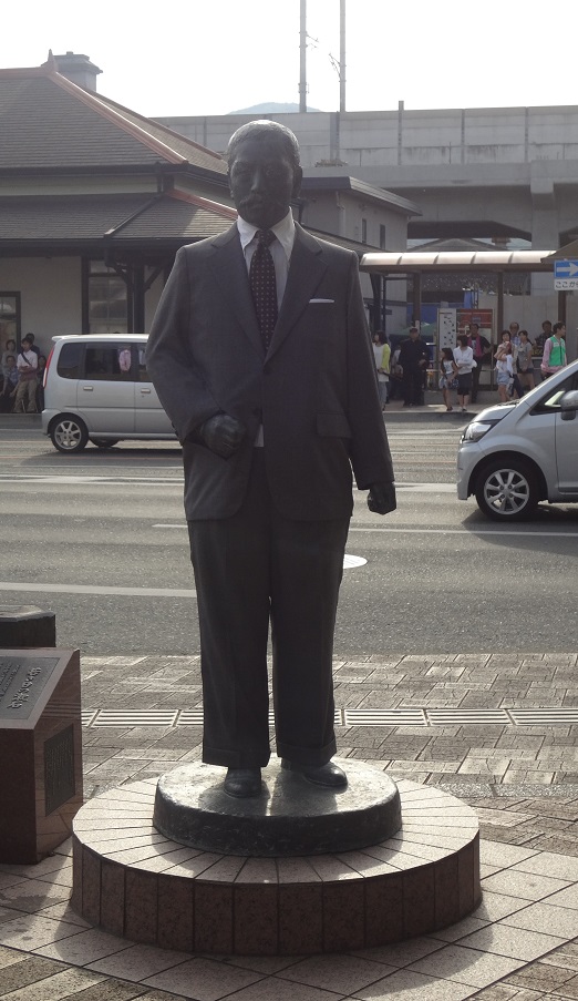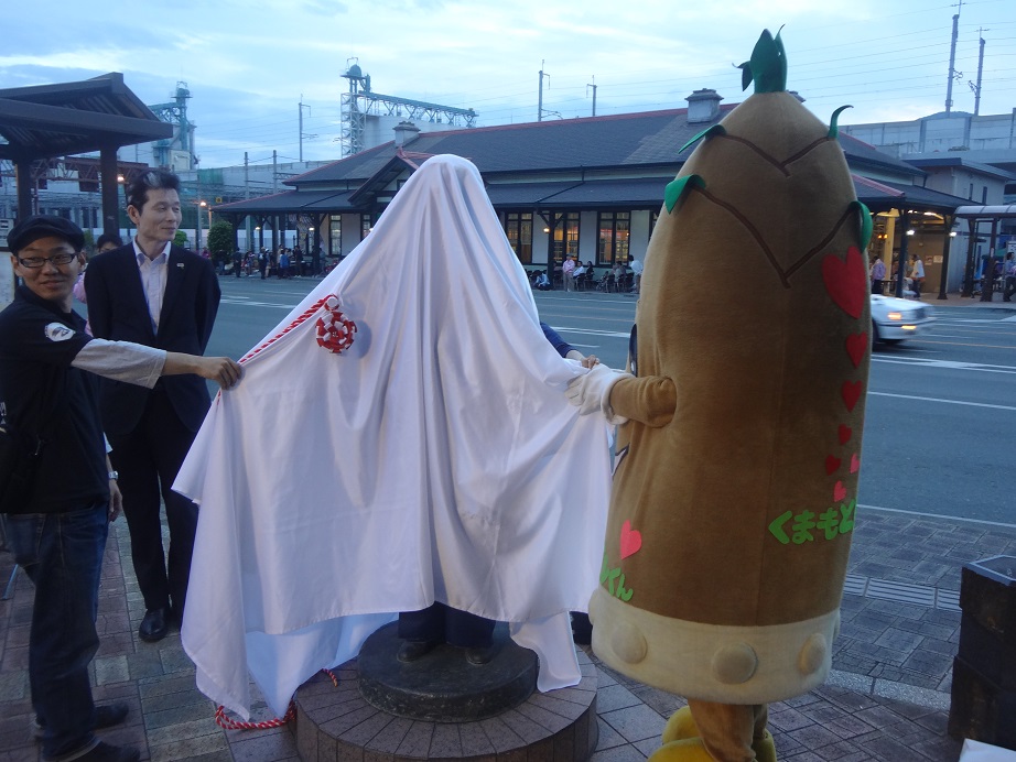 夜の上熊本駅を背景に夏目漱石とツーショット。