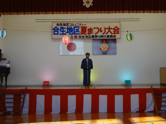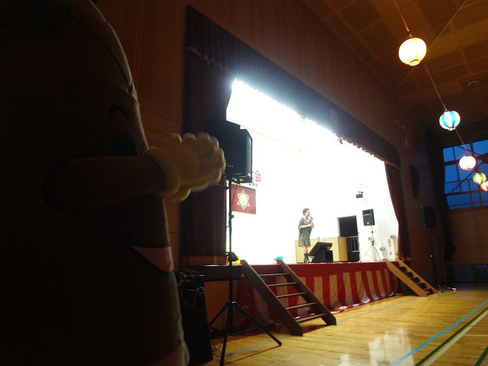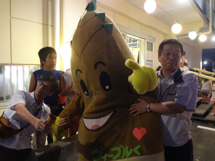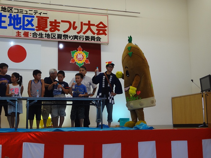 平成27年8月22日(土曜日)、第22回合生地区夏まつりに参加しました。 最終更新日:2015年8月22日 ヴィーブルくん、第22回合生地区夏祭りに参加する、の巻 平成27年8月22日(土曜日)、合志市総合センター"ヴィーブル"のマスコットキャラクターヴィーブルくんが第一小学校体育館で開催された第22回合生地区夏まつりに参加しました。このおまつりは毎年開催されている伝統ある地区のまつりであり、お誘いを受けたヴィーブルくんは二つ返事で参加することにし、夏休みのイベント三連戦は西合志第一小でフィナーレを迎えることにしました。 今回の記事は地元のお祭りの活動報告ということもあり、張り切ってたくさんの写真を掲載しています。携帯端末から閲覧している人はパケ死しないように注意しましょう。 ヴィーブルくん、楽屋入りする 祭り当日は晴天にも恵まれ、汗ばむほどの陽気でした。ヴィーブルくんは田んぼ道をてくてく歩いて西合志第一小学校を目指しました。 誰もいない。この道路はたけのこ専用道路のようだ。 それにしてもいい天気だなぁ。 案内看板を発見! レッツゴー! それにしてものどかな風景だなぁ。 道中、人の気配は感じませんでしたが、夏祭りの準備は万端のようです。 おっ、ちびっこ さっそく記念撮影だ。 消防車も手配しているよ。 ちびっこ、ステキな笑顔だね。 さて、楽屋はこっちかな。 む、張り紙があるぞ。 ほう、これまた広くて快適な楽屋が手配されているぞ。 空調完備の心地いい楽屋だな。 うむ、プロペラマンご苦労。 さて、まつりに協力して盛り上げるぞ。 ヴィーブルくん、ヨーヨーをたのしむ。 ヴィーブルくんはヨーヨー釣りのテントを発見、さっそく挑戦しました。 ヨーヨーの歴史は古く、考古学的観点から見ると、玩具としては人形の次に古い起源を持つほどで、約2,500年の歴史があるそうです。日本では江戸時代中期ごろに中国から伝来し、長崎で流行、享保年間初期には京阪で売られ、江戸でも流行。当時は手車、釣り独楽と呼ばれていました。 プロペラマン見習い、ちょっと行ってくるぞ。 金魚すくいも捨てがたいが、ここは 「スケバン刑事」麻宮サキや「北斗の拳」マミヤの武器、「ヨーヨー」だな。 まあ、見てなよ。 ちょっくら釣り上げるぜ。 きてます!きてます! あらよっと。 ヨーヨー、ゲットだぜ! フッ、今日は調子がいいぞ。 ヴィーブルくん、会場内を散策する 賑やかな人の声がヴィーブルくんを呼び込みます。ヴィーブルくんは出店コーナーを散策してみました。 よっ、きみたちはヨーヨーはゲットしたかね。 握手・・・ 矢吹丈ばりのクロスカウンターと来たか。 む、なぜか泣いている子がいるぞ。 何か、コワイものでも見たのかな。 かき氷もおいしそうだね。 ハイタッチ! さて、次はどこに行こうかな。 たくさん買い食いしているかね。 いいにおいが強くなってきたぞ。 これは食欲をそそる一画だな。 焼きそばと焼きとりを背景に記念撮影。 食べるところ用にちゃんと日陰があるね。 まつりは賑やかでいいもんだな。 体育館内に入ってみた。 ここでも記念撮影。 きみはずいぶんと乱暴だな。 あ、市長と議長、お疲れ様です。 きみたち、ヴィーブルくんのうしろに音もたてずに立つようなまねはするな。 ステージには看板と照明がセットされていました。 きっとたけのこステージがあるに違いない。 リハーサルに余念のないヴィーブルくんでした。 なに、ラムネの一気飲みイベントがあるだって? プロペラマン、よろしく。 ヴィーブルくん、開会式典に出席する 体育館内で開会行事が行なわれました。ヴィーブルくんは野外から誘惑してくる美味しそうな においにも負けずに、お行儀よく式典に参加しました。 高木県議、荒木市長、惠濃教育長、吉永議長。そうそうたる来賓が集結していました。 司会の野口さんの進行で、開会行事が進みます。 清原副委員長が開会の言葉を述べました。 緒方委員長による実行委員長あいさつ。 来賓あいさつ(髙木県議) 来賓あいさつ(荒木市長) ヴィーブルくんはお行儀よくおはなしを聴きました。 もちろん、ヴィーブルくんも特別ゲストとして紹介されました。 ヴィーブルくん、募金に協力する 祭りの場を借りて、ビーチバレー県大会出場のための募金のお願いがありました。人が集まる場にはお金が集まります。的を射た作戦です。 ぞろぞろと子どもたちが動き出します。 ステージに集合しました。 かわいいお願いにヴィーブルくんはメロメロになりました。 プロペラマン見習い、早くするのだ。 ヴィーブルくんが、いの一番に募金するのだ。 ヴィーブルくん、「われらが町だよ西合志」を舞う 西合志第一小児童によるおどり「われらが町だよ西合志」をいっしょに舞うことにしました。ヴィーブルくんも、ちゃんと踊れるかな? ヴィーブルくんも輪に入れておくれ。 なんとなく、gifアニメでご覧ください。 ♪青い空 土と草 われらが町だよ 西合志 ヘイ!♪ よくできました! ヴィーブルくん、ラ