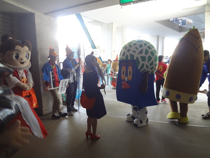 真っ赤な染まるスタジアムにふれきんちゃん(長洲町)が映えます。