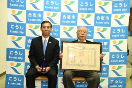 後藤昭巳さんが高齢者叙勲を受章されました 最終更新日:2018年3月7日 3月7日(水)に、須屋にお住まいの後藤昭巳氏に対して、旭日単光章の高齢者叙勲伝達式を行いました。 後藤氏は昭和50年5月、地域住民の推薦を得て西合志町議会議員に初当選、以来平成3年4月までの間、4期16年の永きにわたり在職し、議会の円滑な運営に尽力するとともに地方自治の伸展に大いに寄与され今回の受章となりました。 私から勲記・勲章の代理伝達を行い、心からお祝いを申しあげました。